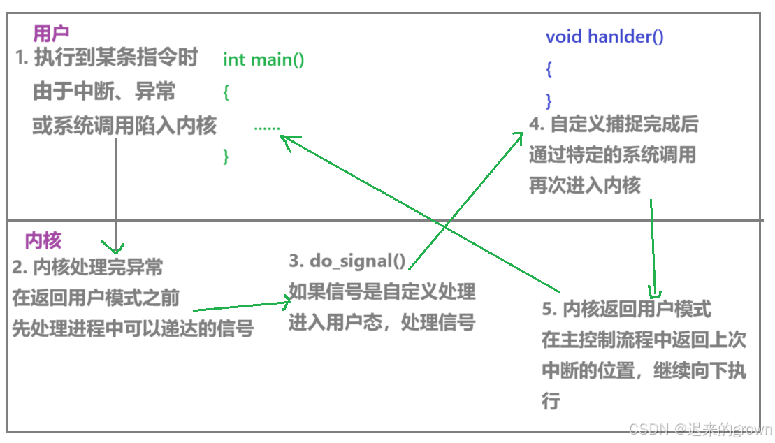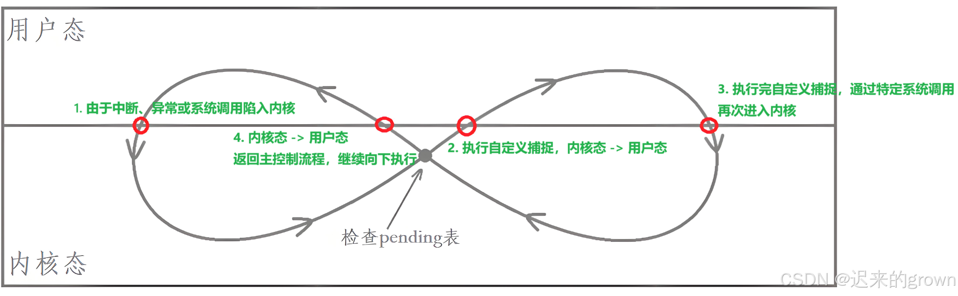 我们知道在进程运行时,通过系统调用或者中断等等陷入内核,进入内核态;而在进行自定义处理时,再有内核态回到用户态;自定义处理完成之后,再通过特定的系统掉用再进入内核态;最后才回到最初中断的位置,由内核态进入用户态。