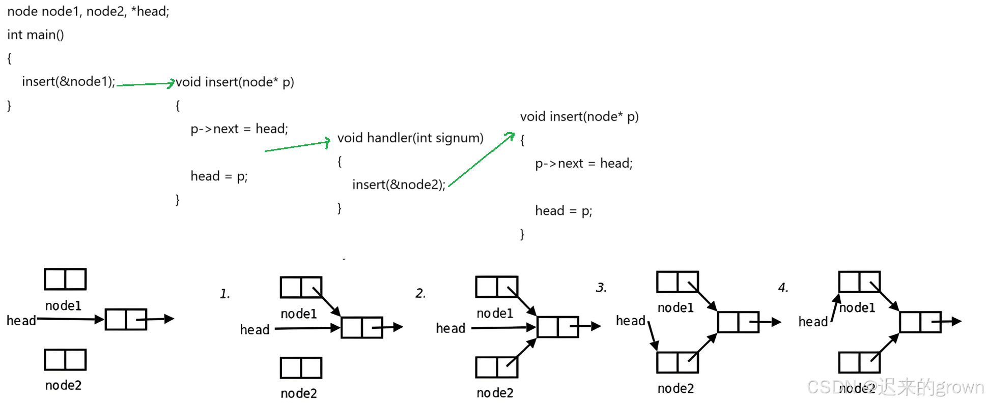 如上图所示,在调用insert时,执行至某位置,进程收到信号转而去执行handler方法,而在handler方法中有调用了insert方法;这样导致了最终的结果不符合我们的预期。