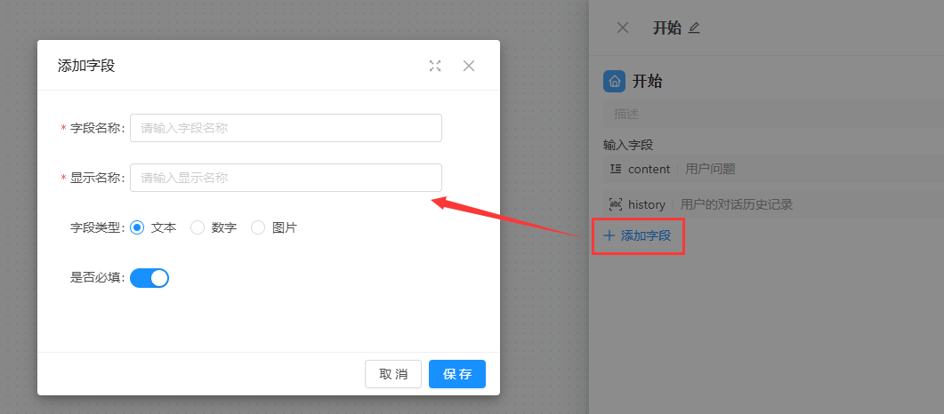 通过点击“添加字段”按钮,可以添加自定义的输入参数。添加时需要填写以下信息: