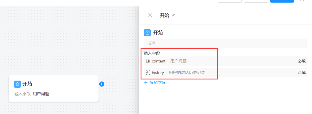 所有的AI流程,默认都会有且只有一个开始节点,而且该节点无法删除。