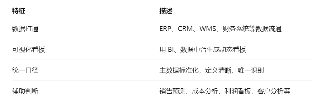 - 建数据中台(哪怕只是逻辑层的),把ERP、CRM、WMS、财务数据汇集起来;