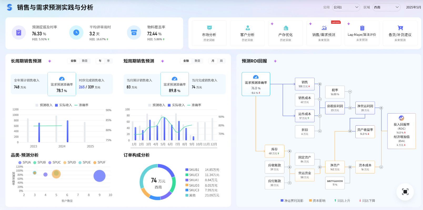 - 所有业务数据能从一张图里看清:客户表现、产品毛利、订单履约、库存结构;