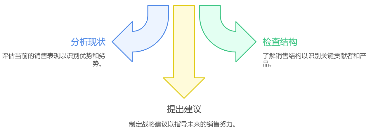 其实,不管你用不用 BI 工具,销售分析本质上就三步:先问清楚问题、再拆清楚结构、最后讲清楚建议。