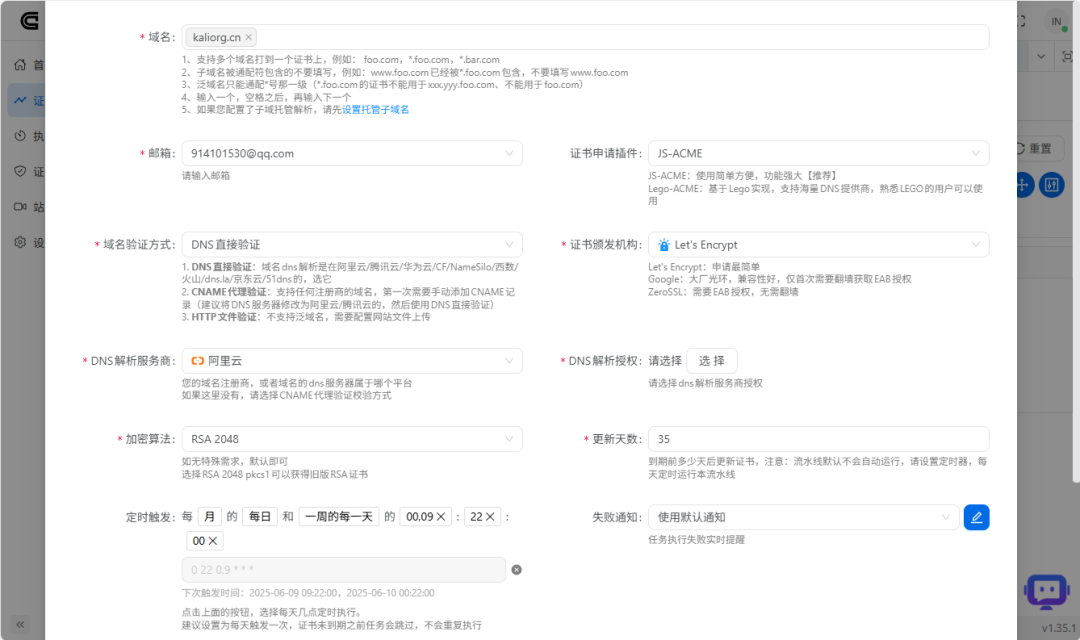 目前支持Let's Encrypt、Google、ZeroSSL证书。