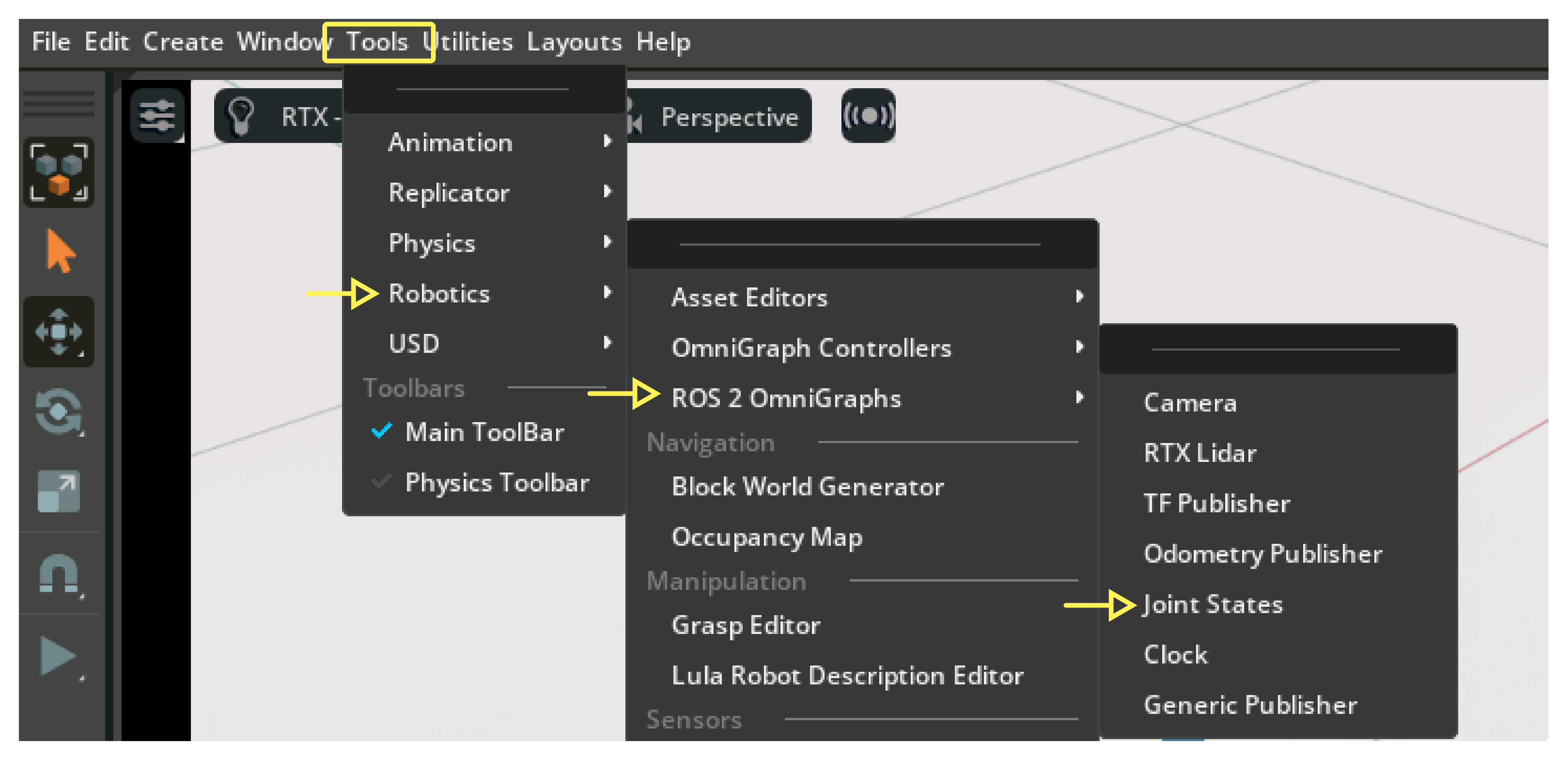 请按照 Tools -> Robotics -> ROS 2 OmniGraphs -> Joint States
