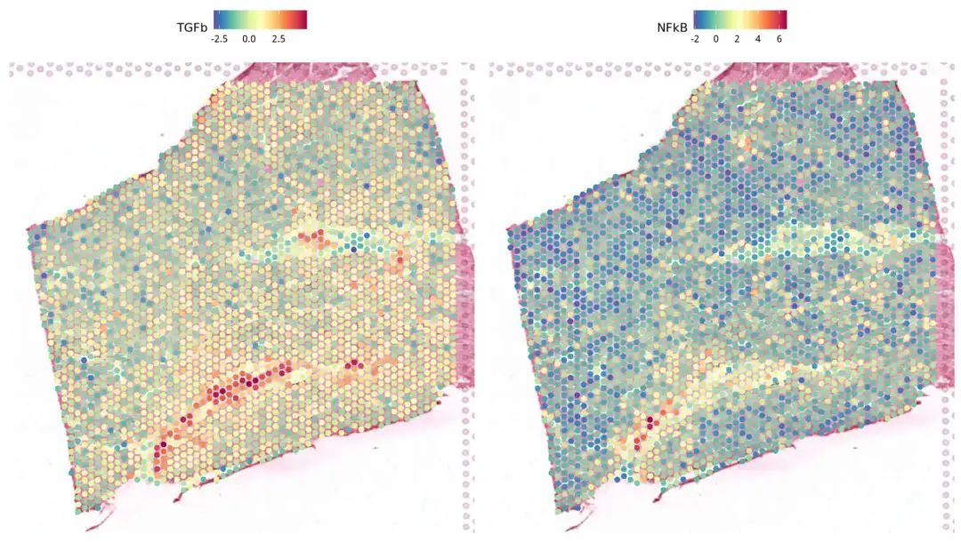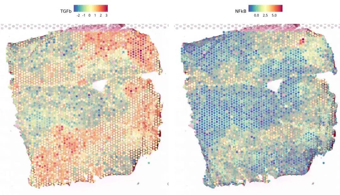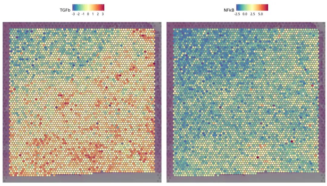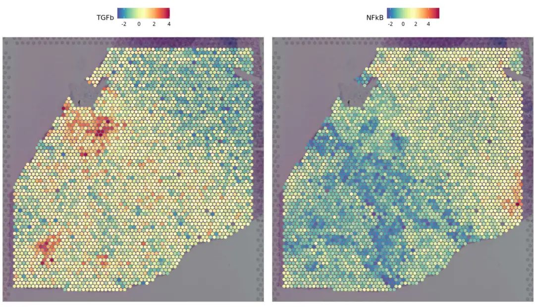 SpatialFeaturePlot(BZ_P3, features = c("TGFb","NFkB"),pt.size.factor = 500)