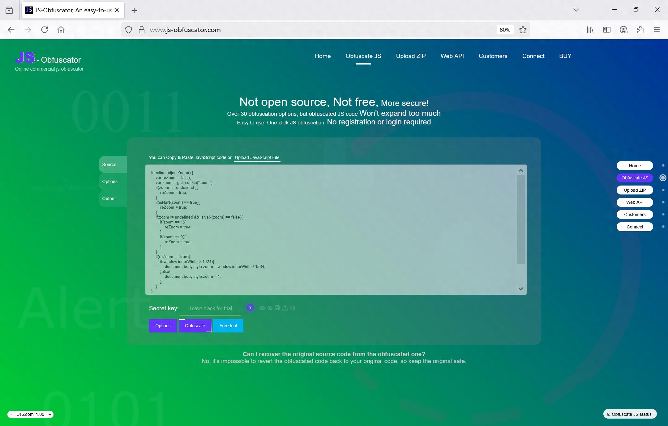 如果不想他人知道自己是如何实现这个功能的,可以将JS代码加密,比如用JShaman、JS-Obfuscator等提供的JS代码混淆加密服务: