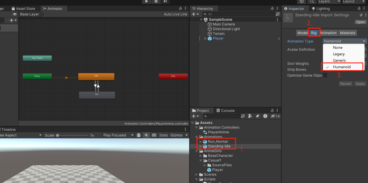 1.刚弄进来的动画可能得调调设置。我们先选中那个动画,然后点一下“Rig”,接着把站立和跑步的动画类型改成“人形”(Humanoid)的,这样就能更贴合角色的动作了。
