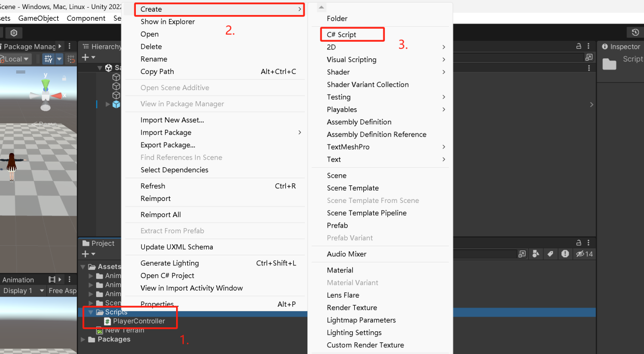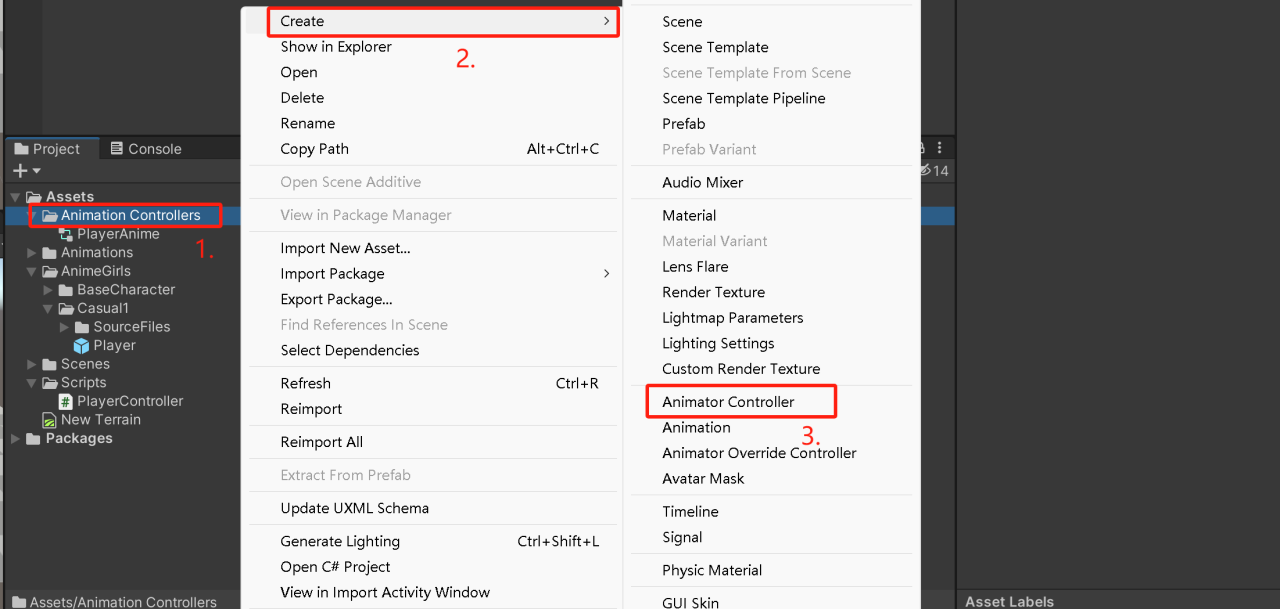 4.在Assets文件夹里,用鼠标右键点一下,然后找到“Animation Controllers”。接着点一下“Create”,在弹出的菜单里选择“Animator Controller”,这样就能创建一个新的动画器了。