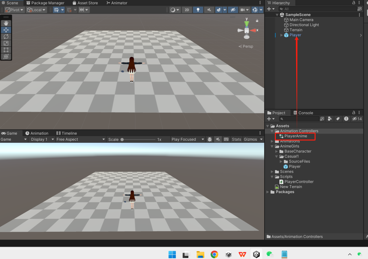 这里我已经搞定了模型和动画,都准备好啦!要是有小伙伴还不太明白怎么操作,可以去看看我之前发的那个“导入模型”的视频,视频的链接我会放在文章最后,点击连接打开在我的抖音或者其他平台连接的个人主页上能找到。好,我们先来第一步,把主角拖到我们的开发场景里去。