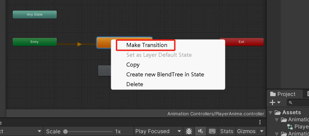 7.现在我们来设置动画之间的过渡。分别选中“站立动画”和“跑步动画”,然后右键点击它们,从弹出的菜单里选择“Make Transition”。这样就能创建一个动画过渡了,也就是让角色可以从站立状态切换到跑步状态,反过来也行。