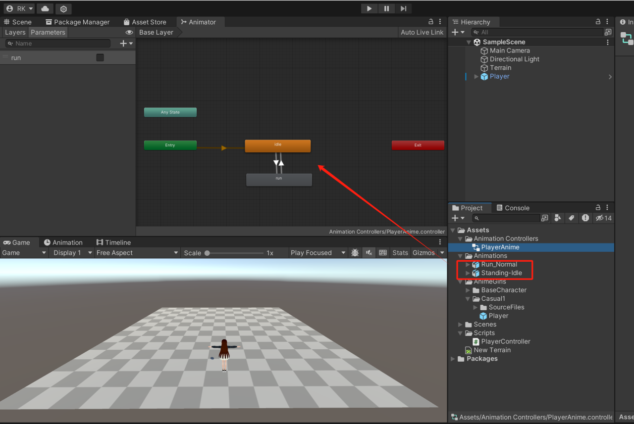 接下来,选中动画之间的过渡线,然后给这条线添加上刚才创建的变量。设置一下,当Run变量是true的时候,角色就切换到跑步动画;当Run变量是false的时候,角色就变回站立状态。