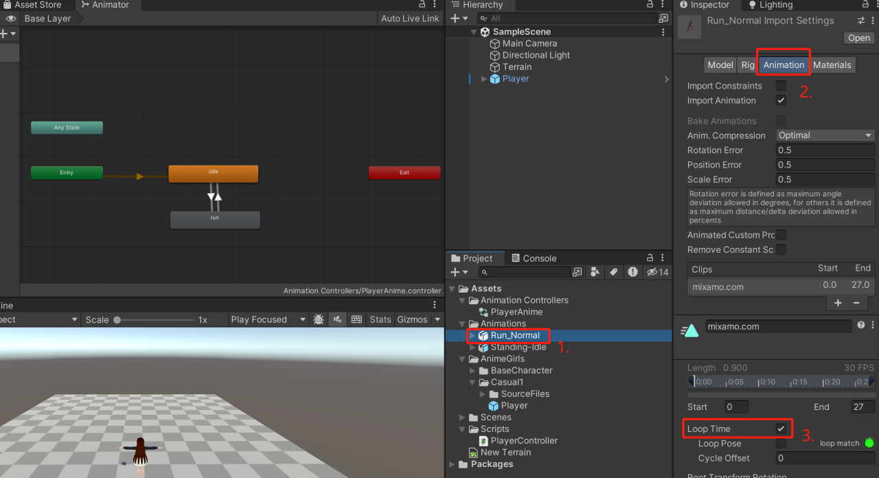 2.接下来,我们得把跑步动画挑出来,然后点选“Animation”这个选项。记得把那个循环播放(Loop Time)的勾给打上,这样动画就能无限循环播放了。
