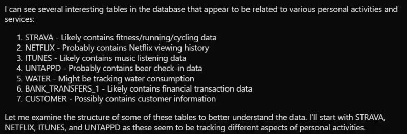 WHERE table_name = 'STRAVA' ORDER BY column_idAnd again, I approve the request. I recognize what the LLM is after, and I believe this is safe to run on my fun, side project database.