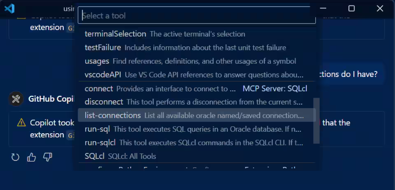 You can observe the additional tools available to Copilot under the SQLcl MCP Server section.