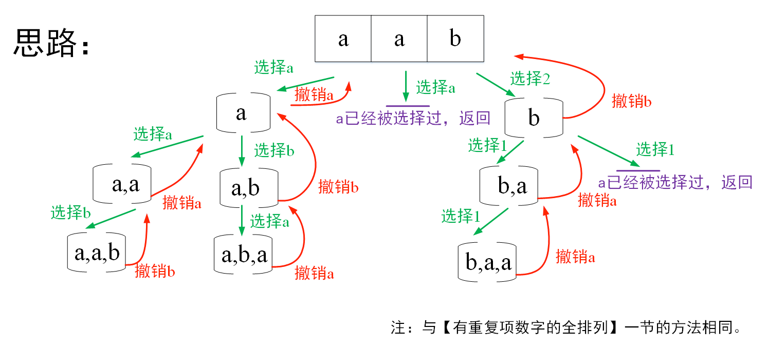 遍历每一个元素,以该元素作为开头的数字数列。首先选取该数字,并标记该数字已经使用过;再递归选择其他数字;撤销该数字,让其他数字作为开头。缩小数字区间:该元素已经使用过;当前元素与前一个元素一样,且前一个已经使用过。