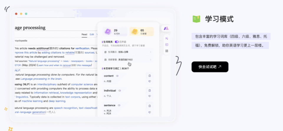 4. 学习模式:学英语的「免费小老师」 会译的「学习模式」对学生党超友好——内置四级、六级、雅思、托福词库,翻译时遇到生词,点一下就能加入「生词本」,还能生成复习计划。我备考雅思时,用会译读外刊,遇到不认识的词划词翻译,顺手标成「雅思高频词」,系统自动整理成词表,比我自己查词典整理省了老多时间!