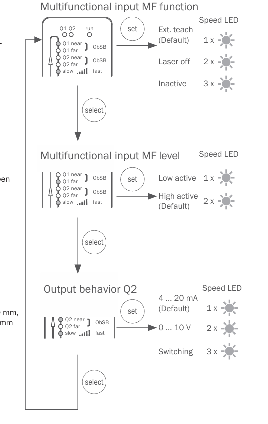 设置方法: 同时长按Select和Set键3秒,直到Q2 near和Q2 far灯同时亮起,将传感器对准背景物体,按下Set键确认,此时传感器将忽略该背景物体,只检测前景目标。