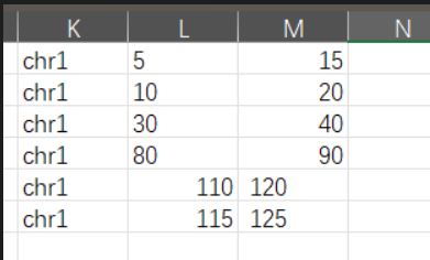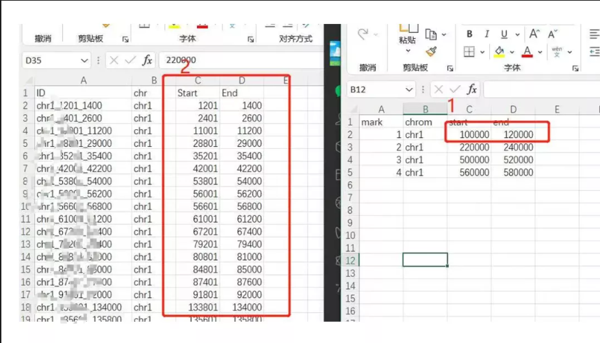 下图1左边是SNP的上下游区间,右边图2是基因的上下游区间,想以图1为标准,将区间内有基因的行放到右边。