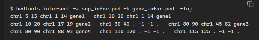 bedtools intersect -a snp_infor.ped -b gene_infor.ped -loj
