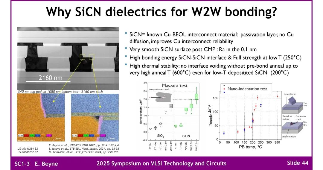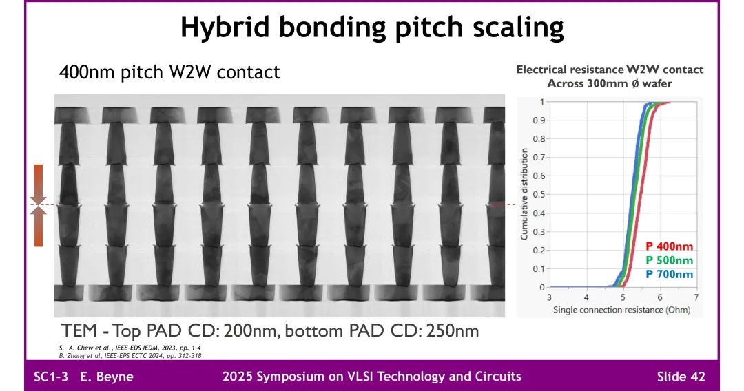 混合键合工艺通过室温范德华力预键合与高温退火实现强键合,SiCN dielectric材料因优异的表面光滑度(Ra≈0.1nm)、高键合能及热稳定性,成为W2W键合的核心介质选择。400nm间距W2W键合的单连接电阻可低至0.5Ω,300nm、250nm间距技术也已实现突破,为超高密度互连提供可能。