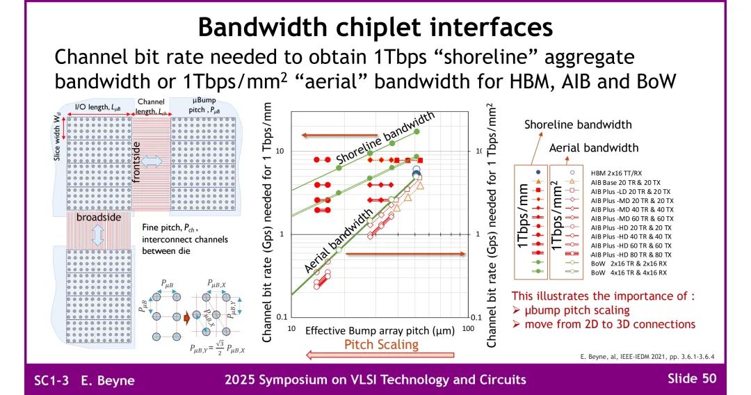 芯粒接口的带宽性能依赖凸点间距与通道速率优化,“边沿带宽”(shoreline bandwidth)与“空中带宽”(aerial bandwidth)指标随凸点间距缩小而提升,推动HBM、AIB、BoW等总线技术向更高速率演进。