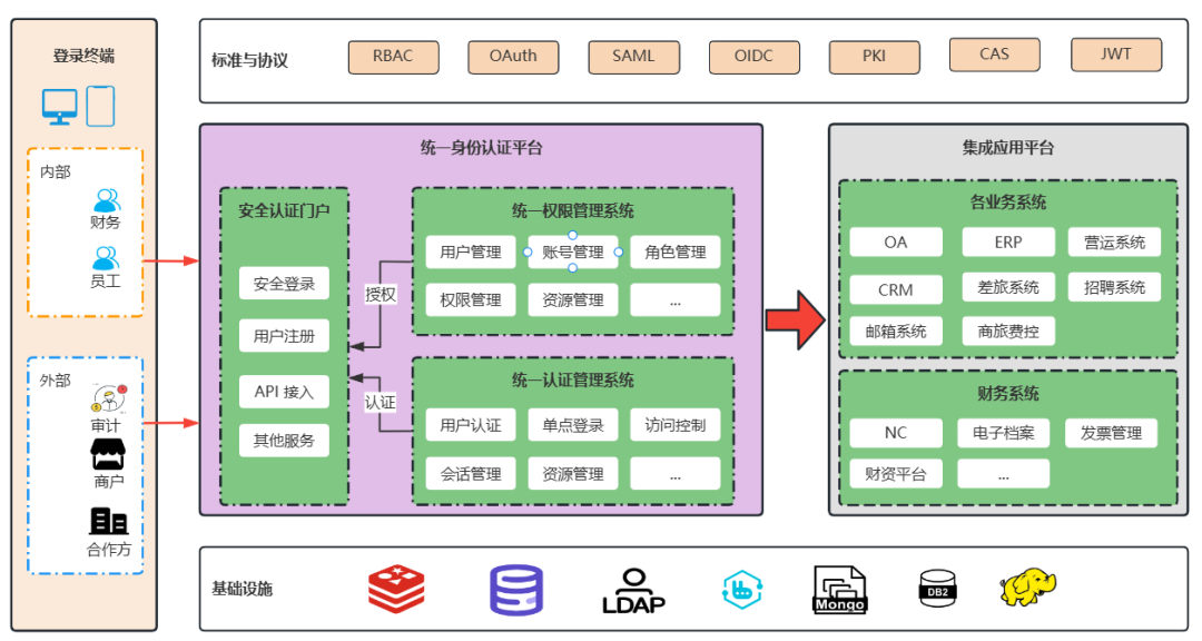 技术方案:采用 CAS 作为认证中心,支持多种标准协议;老系统通过 Nginx 反向代理兼容,外采系统依是否支持标准协议分别对接;安全上采用 HTTPS 加密、JWT Token、多因素认证等措施。整体架构图如下: