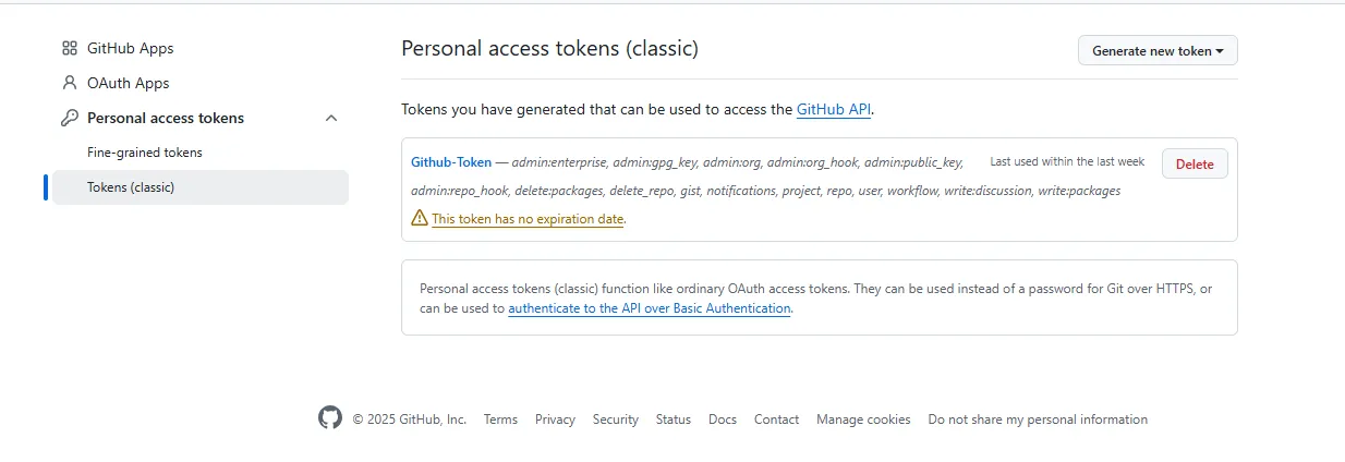 4、 回到 Github 创建 Token,点击 头像 - settings - developer settings - Personal access tokens - Tokens (classic) ,点击 Generate new token ,保存好密钥