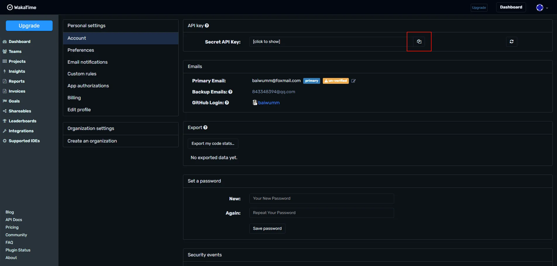 README.md)1、 注册登录 WakaTime 账号,建议使用 Github 登录,点击 首页 -> 右上角头像settings-> account-> apiKey :