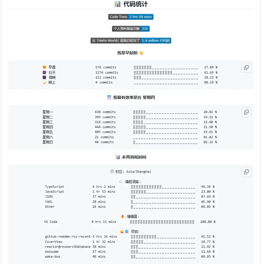 9、 到这里,所有配置就已经完成, GitHub Actions 会在每天00:00点执行并将该段代码替换为 WakaTime 的统计数据