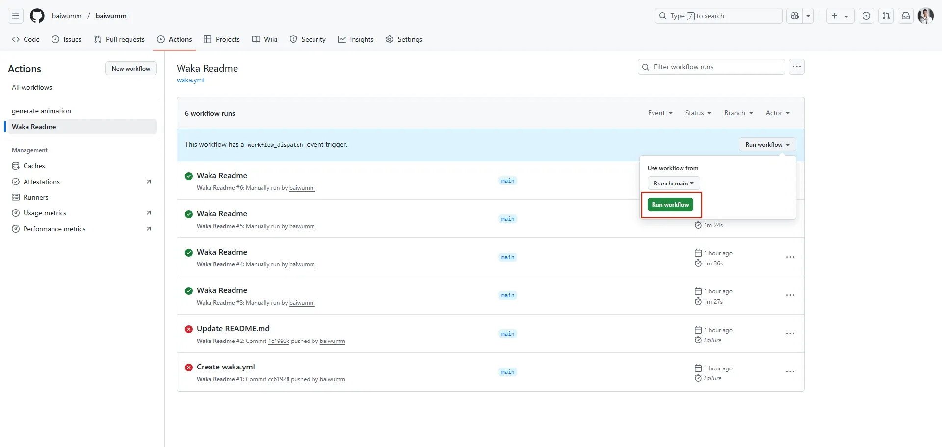 <!--END_SECTION:waka-->8、 点击 Actions ,找到 waka Readme ,点击 run workflow :