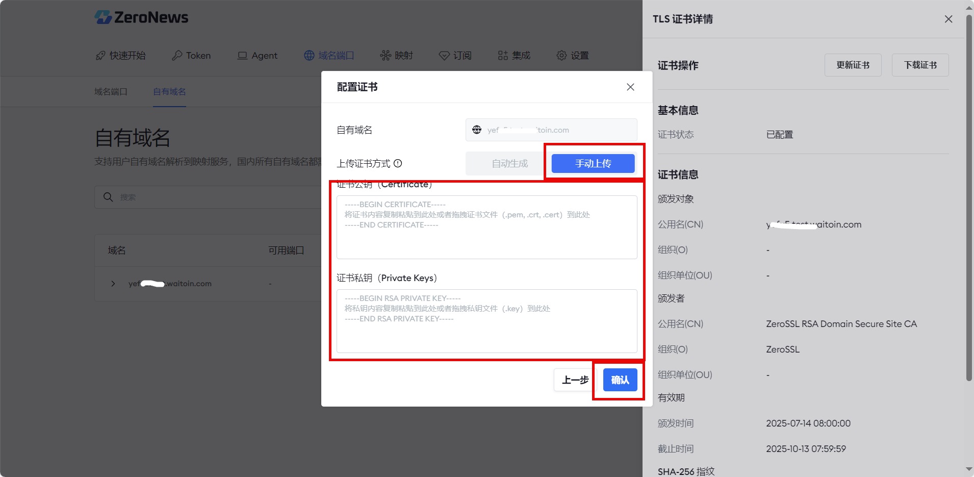 ● 手动上传证书,适用使用企业现有证书 ,需匹配PEM格式公钥/私钥