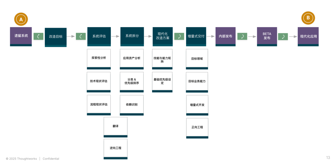 如图所示,其展示了从遗留系统到现代化应用的完整改造路径,可以分为九个阶段: