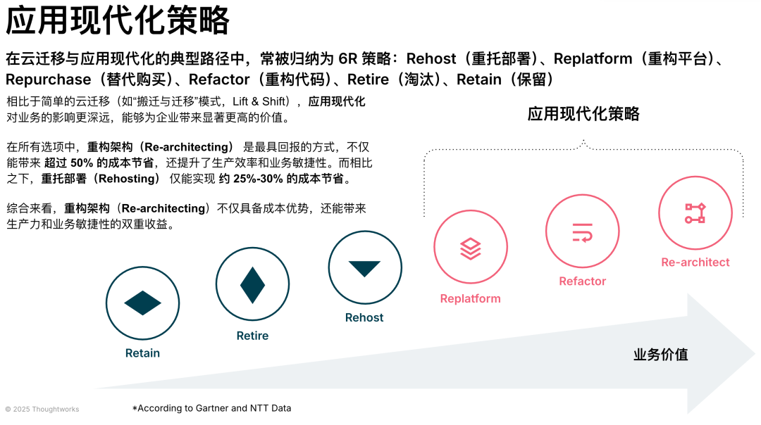 在云迁移与应用现代化的典型路径中,我们(结合 Gartner 与 NTT Data)将其归纳为 6R 策略:Rehost(重托部署)、Replatform(重构平台)、 Repurchase(替代购买)、Refactor(重构代码)、Retire(淘汰)、Retain(保留)