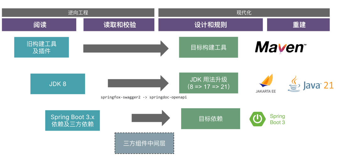 代码分析与理解只是第一步,最终目标是实现可演进的新系统架构,以及借助 AI 实现自动化迁移和语法规则转换。
