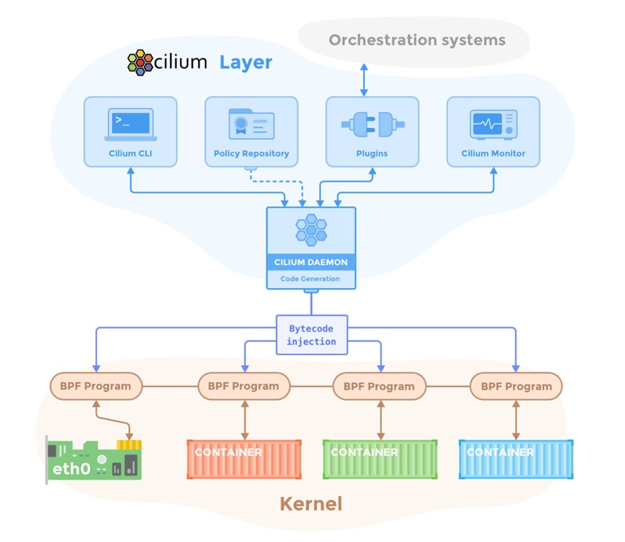 Cilium位于容器编排系统和Linux Kernel之间,向上可以通过容器编排系统为容器进行网络以及相应的安全策略进行配置,向下可以在Linux内核hook点挂载eBPF程序,来控制容器网络数据的转发以及安全策略的实施。
