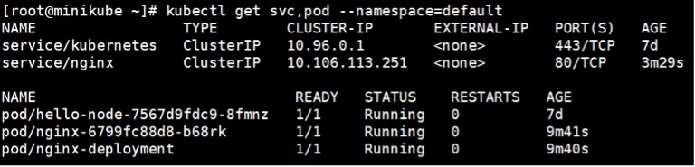 [root@minikube ~]# kubectl get svc,pod --namespace=default