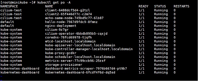 [root@minikube ~]# rm cilium-linux-amd64.tar.gz部署完Cilium的集群会将Pods添加到kube-system命名空间。