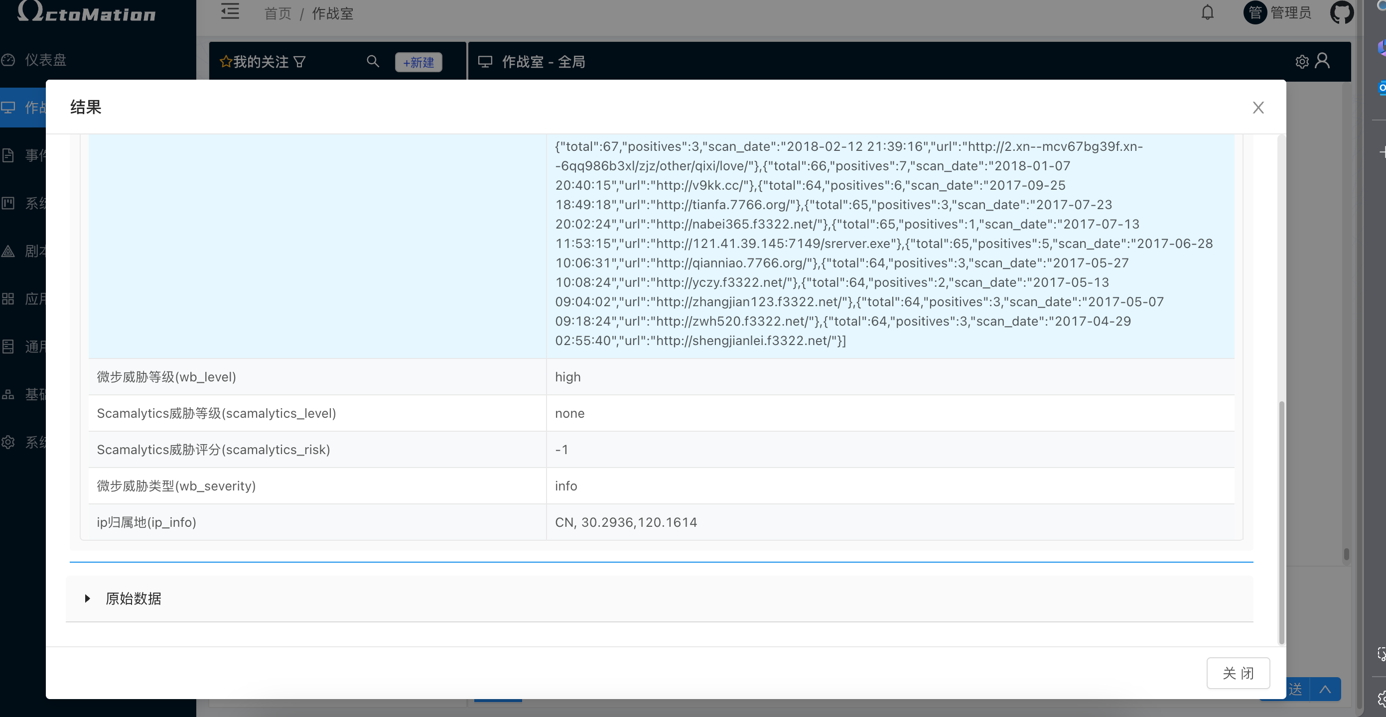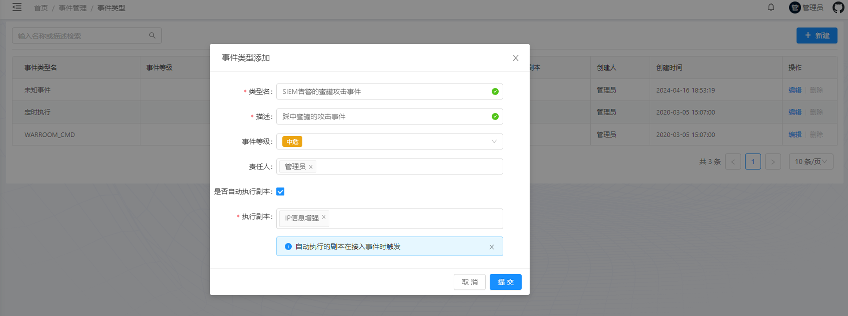 登录OctoMation后台,访问到【事件管理】|【事件类型】,点击【新建】即可创建新的事件类型。勾选【是否自动执行剧本】,选择【IP信息增强】
