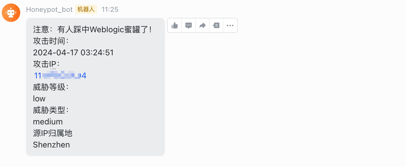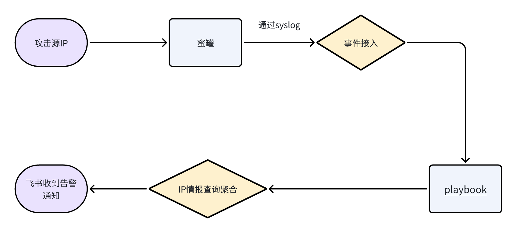 蜜罐获取到攻击IP通过syslog发送到SOAR,通过SOAR进行剧本编排发送到飞书