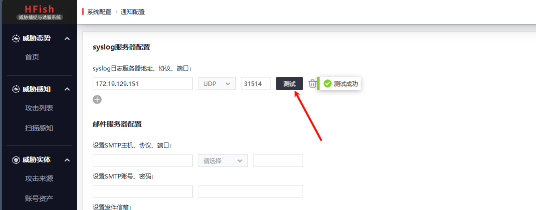 选择Grok正则表达式方式识别。在输入框填写一段日志样本,样本可以选择来自于蜜罐【系统配置】| 【通知配置】中【syslog告警示例】: