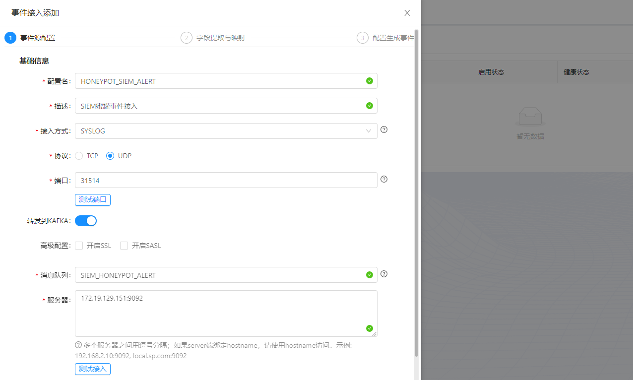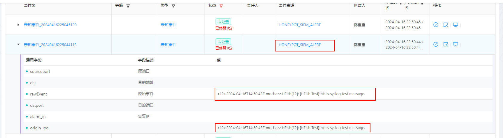 查看【事件列表】发现测试的事件已经生效。说明syslog和kafka接受日志都正常。