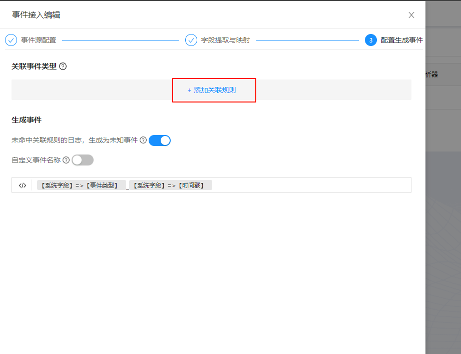 进入规则设置页面,此处针对已经格式化后的事件信息字段进行规则判断,以确定事件对应的事件类型。点击【新建关联规则】