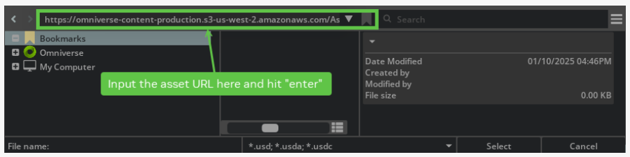 28.Isaac Sim 资源路径无法直接在 Omniverse Kit 文件选择对话框中使用。作为临时解决方案,若使用 S3 资源路径,请复制路径后按回车键确认,而非点击“选择”按钮。