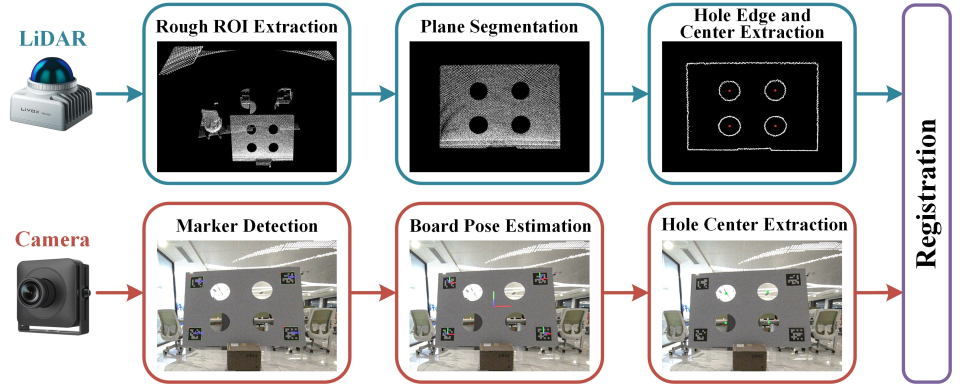 1. 激光雷达数据处理阶段(蓝色部分):我们执行粗略感兴趣区域(ROI)提取、平面分割和圆孔边缘提取,以在激光雷达坐标系中定位四个孔中心。