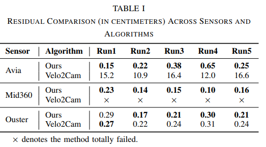 此外,图4展示了在 Livox Avia 和 Ouster 传感器配置下着色点云的定性比较。在所有情况下,点对点配准残差均保持在 6.5 毫米 以下,证明了 FAST-Calib 的高精度对齐能力。
