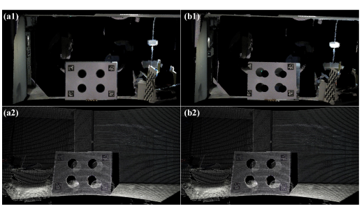 如图4所示(a)和(b)显示了用外部颜色着色的点云分别通过我们的方法和Velo2Cam估计的参数,所有用于联合校准的数据对。(a1)和(b1)对应于Avia而(a2)和(b2)对应于Ouster LiDAR