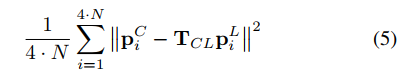给定在相机坐标系中提取的点集PC和在激光雷达坐标系中提取的点集PL(均为圆孔中心),目标是找到一个刚性变换TCL,以最小化对应点之间的距离。通过最小化以下最小二乘误差来估计最优变换TCL:
