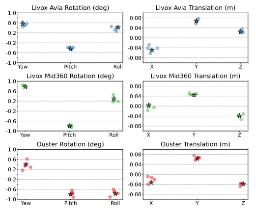 如图 3 所示,散点图展示了 Livox Avia、Mid360 和 Ouster 配置下收敛的外参分布。在每种传感器配置中,相机与各种激光雷达模型之间的估计外参在所有六个自由度上都表现出低方差,证明了 FAST-Calib 的一致性和鲁棒性。