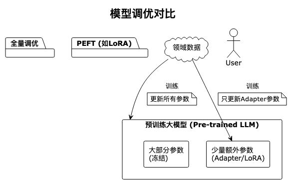 - 全量调优 (Full Fine-Tuning): 更新模型所有参数,效果好但成本极高。